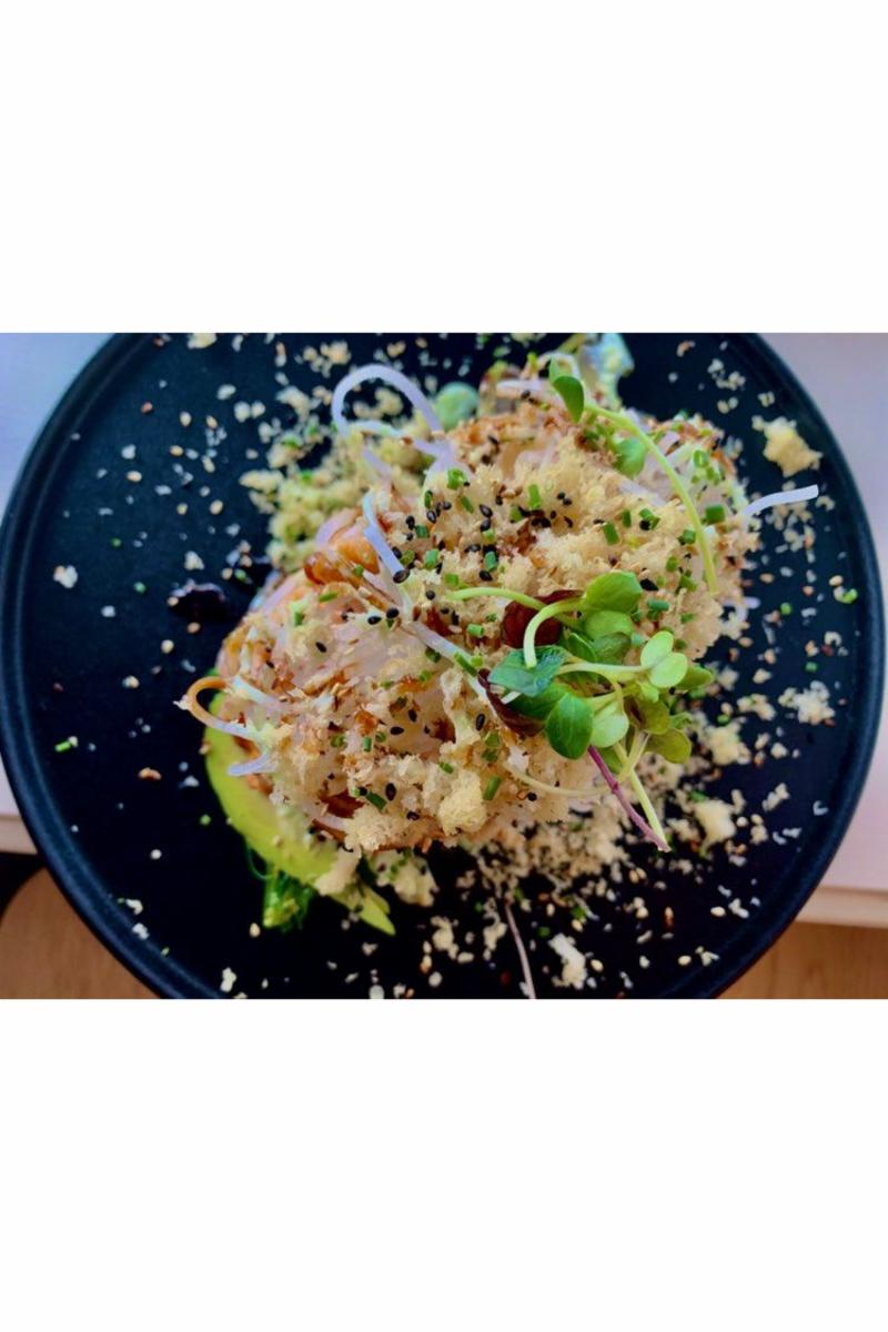 Friterte tigerreker vendt i spicy majones, avocado, fersk mango, gulrot, reddik, asparges, eple, granateple og sjøgress. Toppet med mangomajones, terriyakisaus, honning- og sennepsaus.