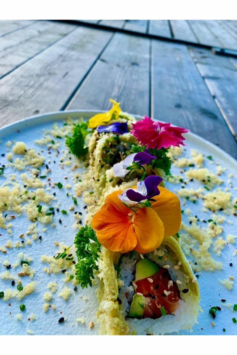 Laks , avocado, gulrot, og agurk med spicy majones rullet i avokado. Toppet med crispy tanoki.
