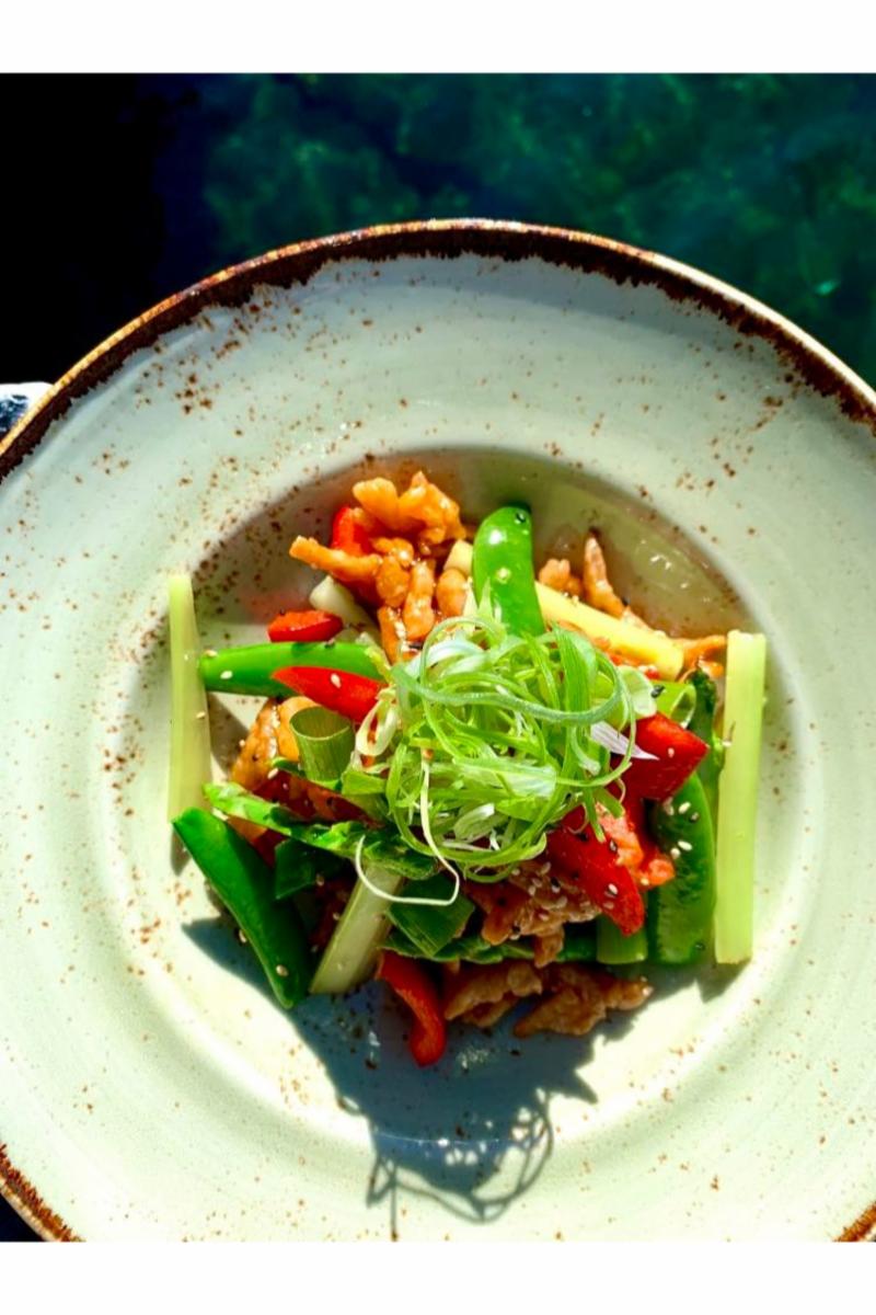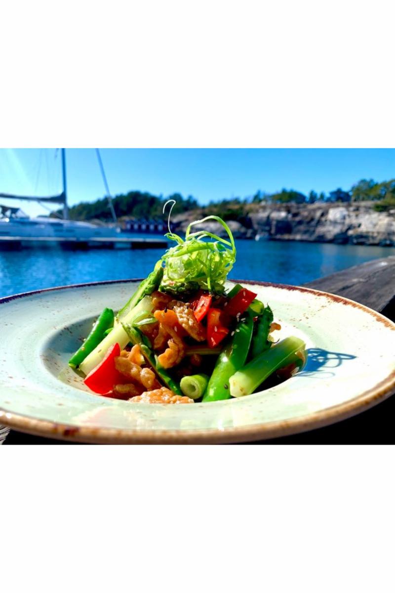 Fritert finstrimlet kylling, asparges, sukkererter, paprika, stangselleri og ris. Toppet med plomme- og chilisaus.